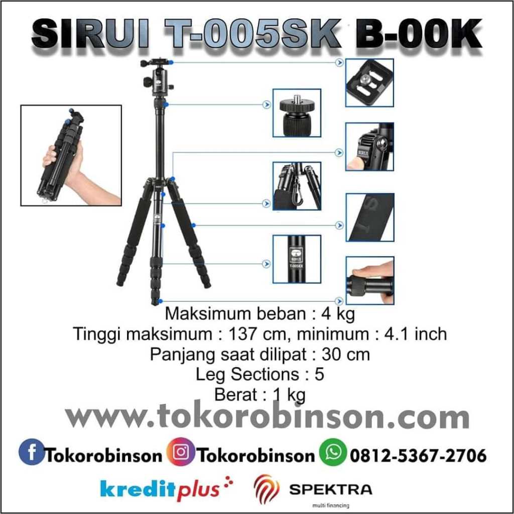 T-005X Aluminium Tripod dengan C-10S Ball Head dari Sirui adalah tripod kompak, ringan, dan stylish sudah termasuk ball head. Dengan kaki yang dapat dilipat, tripod ini hanya berukuran 30 cm dengan kepala terpasang dan beratn hanya sekitar 1 kg. Tripod ini dapat menahan beban hingga 4 kg, cocok untuk kamera DSLR dengan lensa ringan dan sangat ideal untuk kamera atau camcorder kompak dan tanpa cermin. T-005X dilengkapi kunci twist untuk kemudahan pemasangan dan masing-masing kaki memiliki mekanisme pengunci sudut kaki otomatis untuk kecepatan dan kenyamanan. Kolom tengah dapat dilepas memungkinkan pemotretan meja dan penembakan rendah. Panjang tipod maksimum mencapai 137 cm dengan kepala terpasang. C-10S adalah ball head yang sangat mumpuni, tombolnya yang terpisah untuk penyesuaian pan dan kemiringan memungkinkan pengguna melakukan tugas seperti fotografi panorama sambil menjaga agar kemiringan terkunci. Arca-Type Compatible QR Plate dan sudah disertakan softcase dan tools.