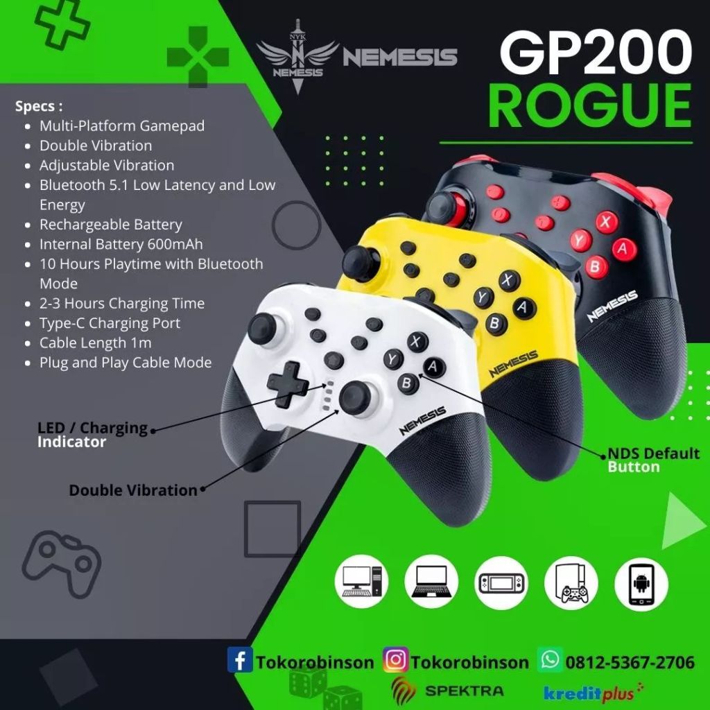 GP-200 ROGUE is a wireless game controller that already equipped Motion Sensor, Adjustable And Double Vibration that makes your gaming session more enjoyable and cool. This controller support PC, Laptop, Nintendo Switch, Playstation and Android Also use Type-C to charging.